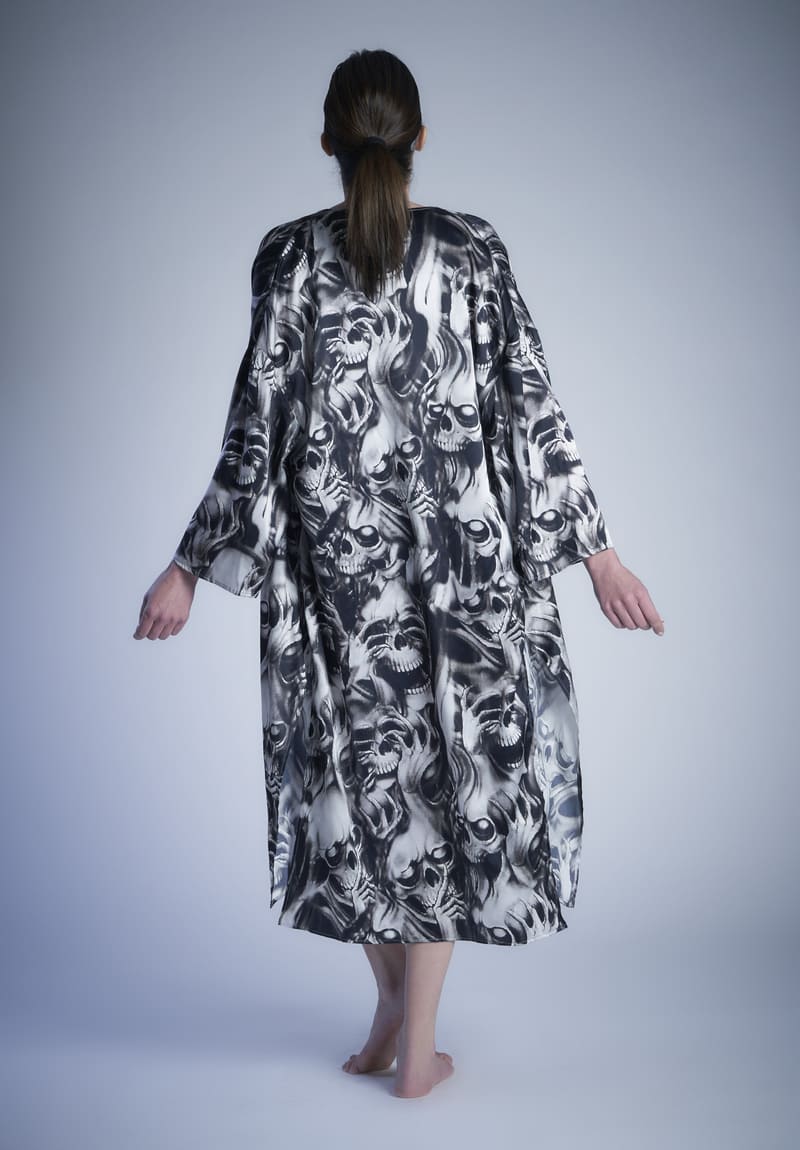 Kimono lungo 100 % seta con stampa all over di teschi dal design “ NON VEDO, NON SENTO E NON PARLO “, in un mondo dove se tutti ci facessimo più i cazzi nostri saremmo sicuramente più rilassati.